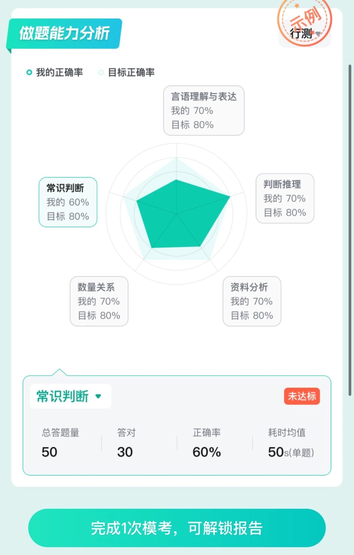 3??生成個(gè)人??紙?bào)告:考完就能查看模考成績(jī)、排名及解析,生成的個(gè)人??紙?bào)告包含各模塊正確率分布、做題能力分析、筆試分?jǐn)?shù)yu測(cè)等內(nèi)容。