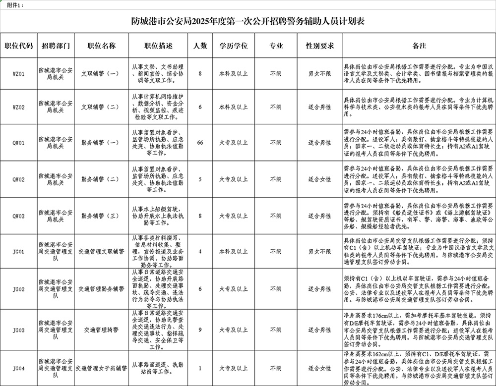 附件:1. 防城港市公安局2025年度第一次公開招聘警務(wù)輔助人員計(jì)劃表
