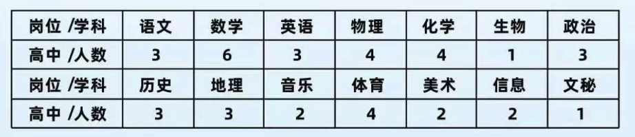 學(xué)校于2023年9月1日正式開學(xué),現(xiàn)有30個行政班,一千余名學(xué)生,專任教師128人,發(fā)展勢頭強勁。為適應(yīng)學(xué)校未來發(fā)展需要,特面向全國師范類畢業(yè)生擇優(yōu)招聘青年教師若干,詳情如下: