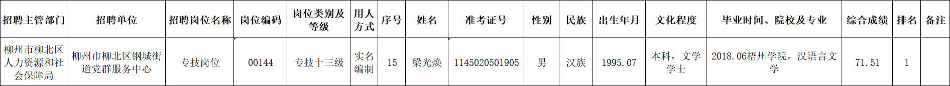 根據(jù)《柳州市2025年度下半年事業(yè)單位公開考試招聘工作人員公告》要求及安排,梁光煥同志經(jīng)面試、考察、體檢合格,符合聘用條件。經(jīng)研究決定,擬聘用梁光煥同志為我區(qū)事業(yè)單位工作人員,現(xiàn)予以公示,公示期為5個(gè)工作日(2026年1月22日至2026年1月28日)。對擬聘用的同志如有異議,請以書面形式,并署真實(shí)姓名和聯(lián)系地址,于2026年1月28日前郵寄或直接送我單位(地址:柳州市勝利路12-8號柳北區(qū)政府4樓417室;郵編:545002,電話0772-2513360),群眾如實(shí)反映有關(guān)問題受法律保護(hù)。