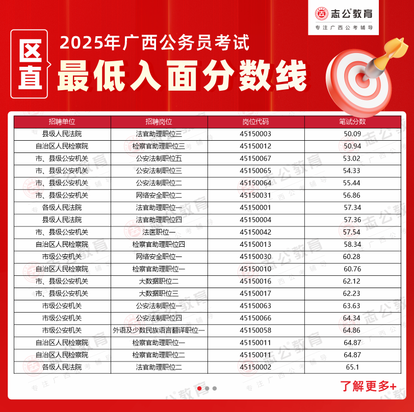 溫馨提示: 以上數(shù)據(jù)均整理自官方發(fā)布的面試資格審查公告,僅供考生參考。2025年廣西公務(wù)員考試面試入圍名單及具體分?jǐn)?shù)線以廣西人事考試網(wǎng)及各招錄單位官方通知為準(zhǔn)。如需查詢更多2025廣西區(qū)考進(jìn)面分?jǐn)?shù)、不同系統(tǒng)的區(qū)直單位分?jǐn)?shù)線,或獲取完整的廣西公務(wù)員面試名單,歡迎持續(xù)關(guān)注志公教育的后續(xù)更新。我們將及時為您整理官方信息,助您全面了解考情,科學(xué)備考。